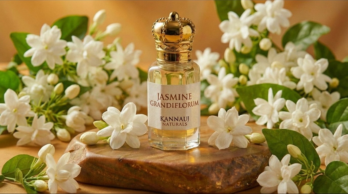 Experience the rich elegance of Jasmine Grandiflorum (South) Attar by Kannauj Naturals. Crafted from premium South Indian jasmine blossoms and traditionally distilled in Kannauj, this attar offers a deeper, more sensual floral aroma with a soft green undertone.